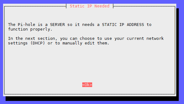 In a previous tutorial we already did all this. I’m not sure why it bothers with this message, as it didn’t show any DHCP settings after anyway. Possibly due to already having a static IP.