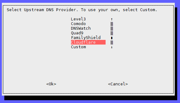 The GUI then provides a selection of DNS providers to use. Cloudflare is the 1.1.1.1 IP we set up in the DHCP tutorial. So I’m going with that. The top option, Google, is the 8.8.8.8 IP we used as a secondary DNS. Feel free to choose whichever you wish.