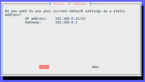 The installer has picked up that we already have a static IP address set up, and do we want to keep it. Well, yes we do.