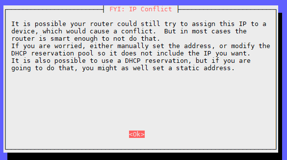 I can safely ignore this warning. Our DHCP server is the Pi itself, and it’s not going to assign its own IP address to another device. As it states, if you still have your router as your DHCP server it still should be fine, with your static IP set.