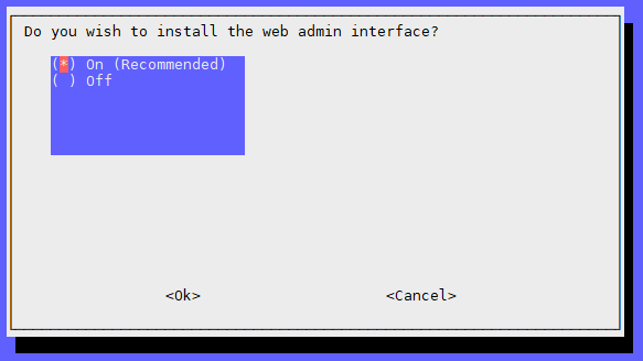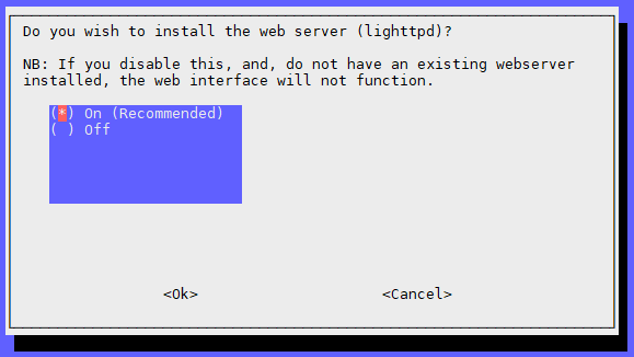 The Pi I’m running doesn’t have a web server package installed. So I’m saying on to this. If you have got something such as Apache already up and running select off. There may be some extra configuration required, later on, if you do already have something.