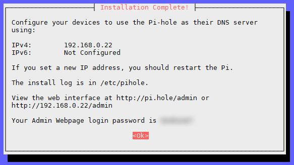 Once the packages are installed you’ll be greeted by a success message. Make a note of the login password, if you requested to install the web admin interface.